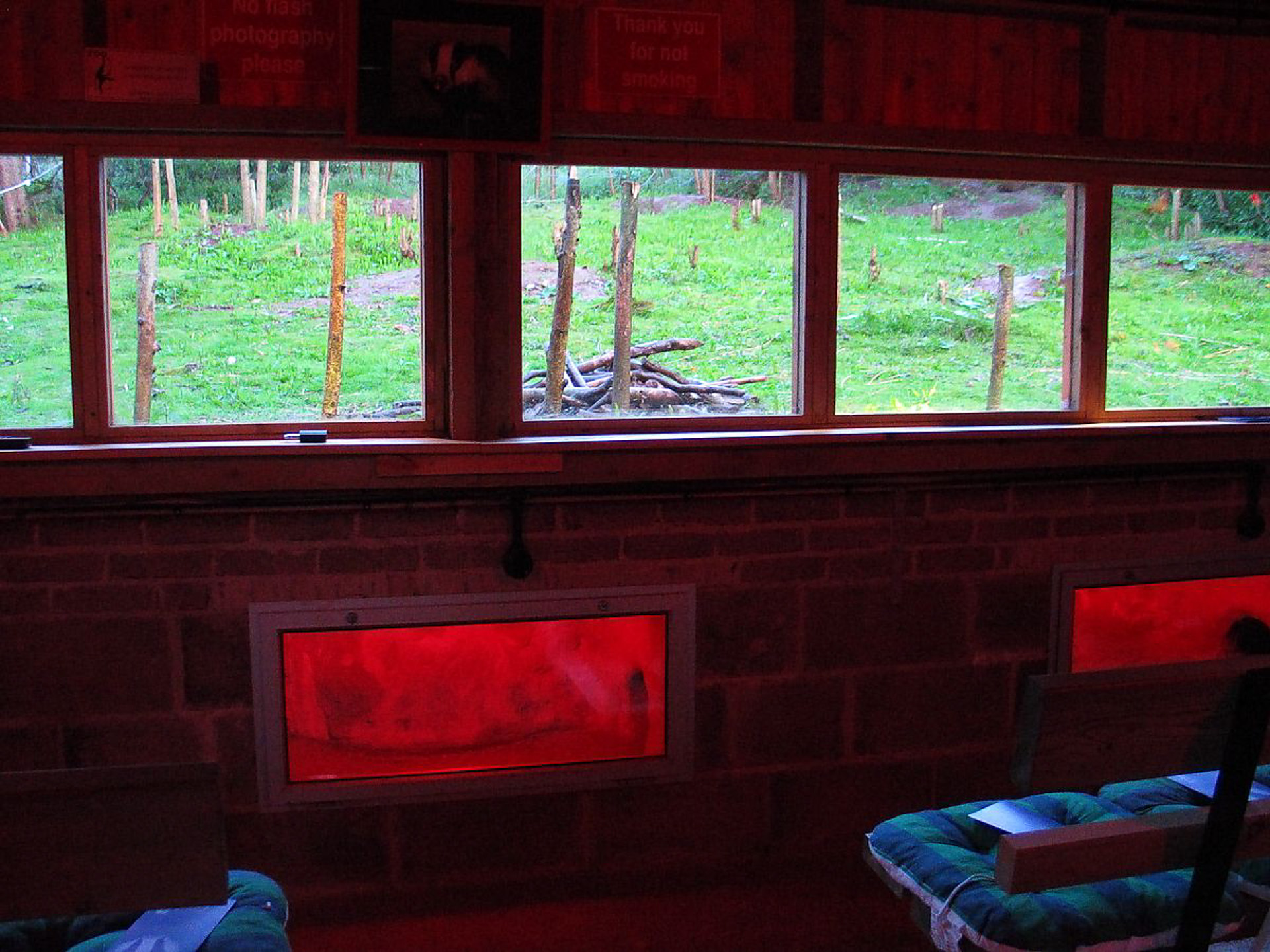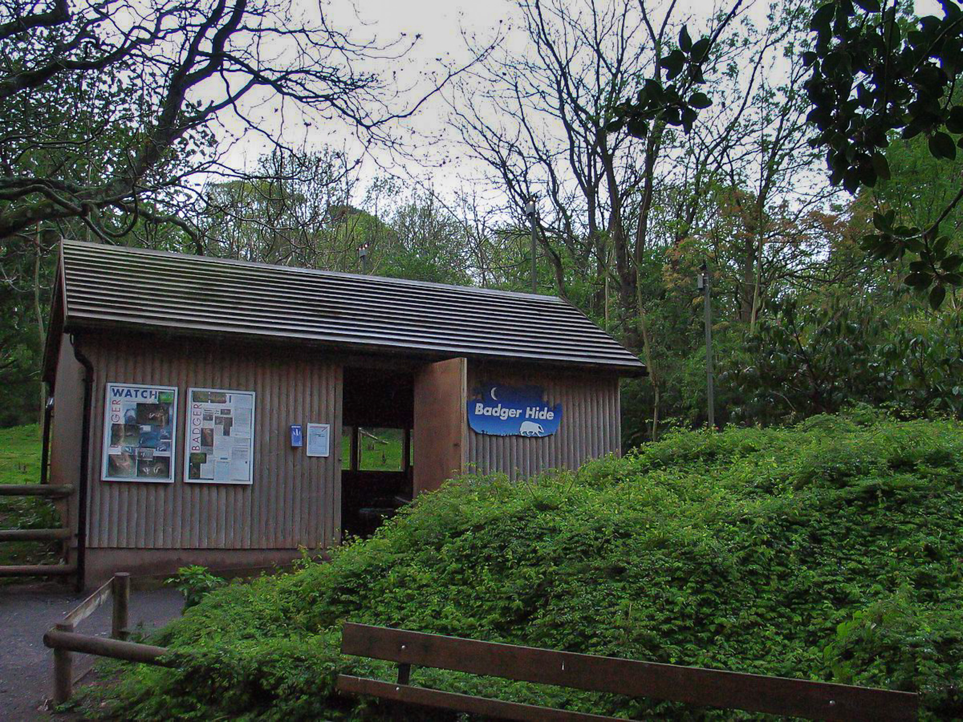 A viewing hide was constructed with room for about 12 visitors. A window for soundproofing gave a view over the site, and artificial tunnels with windows were built to allow viewing of the badgers underground. Badgers like peanut butter which was applied liberally to attract them.